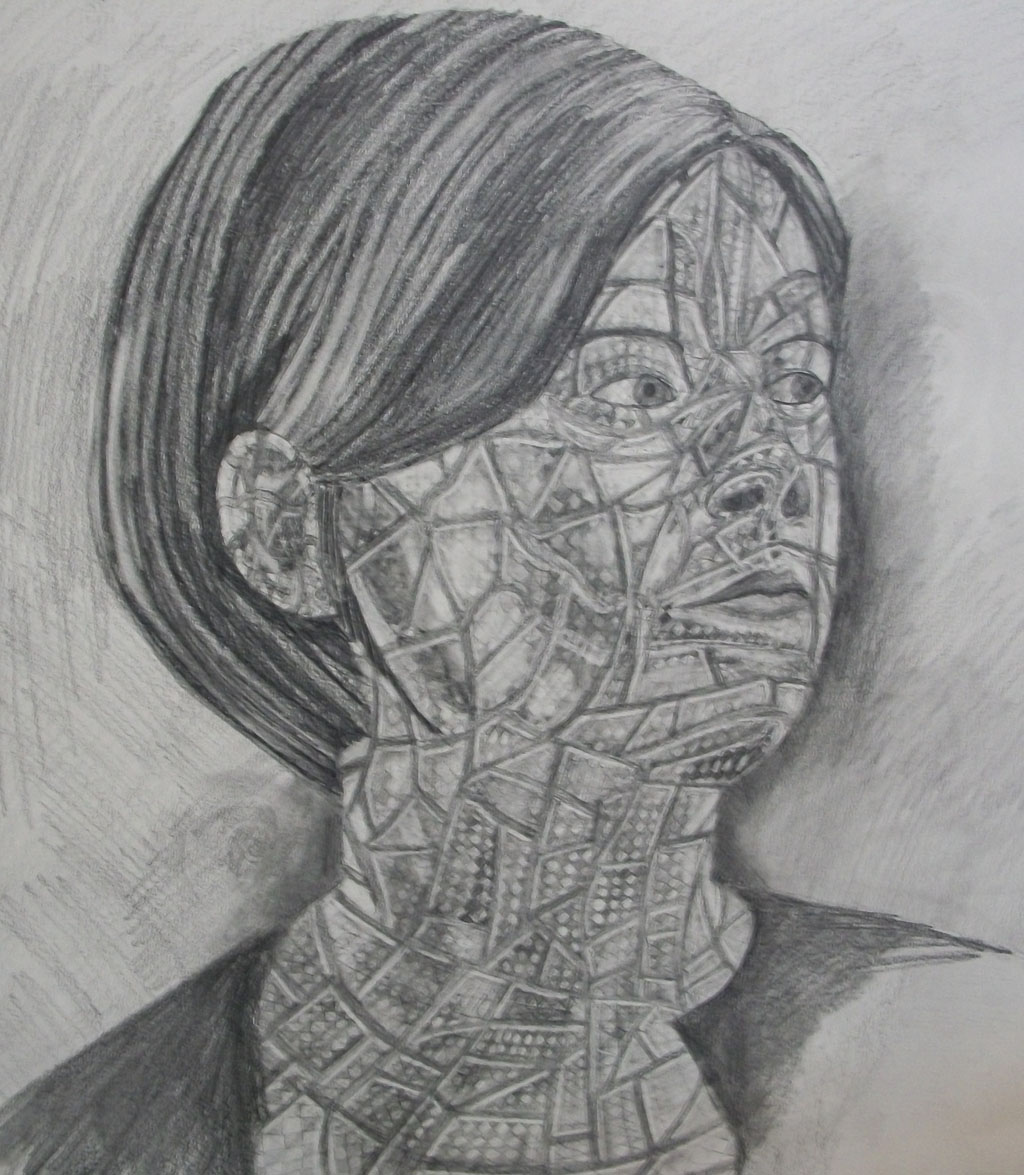 Below – you can see one of the self portraits I created in order to better understand how to go about it. Done in pencil, this portrait has been divided into lines that are raised above the patterned surface of the face.