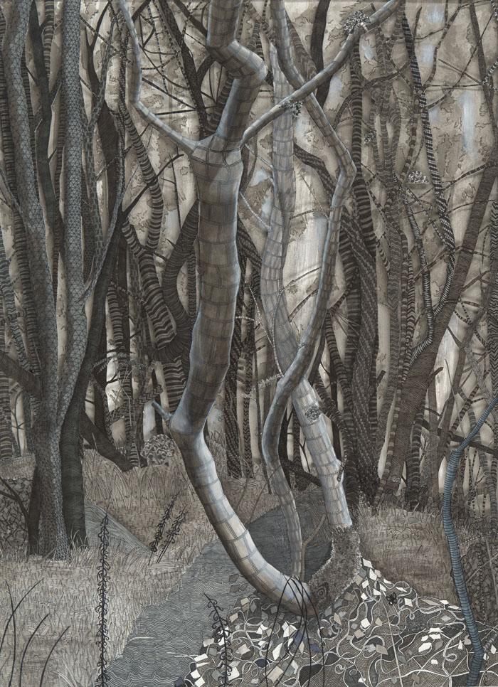 Even before I painted the portrait of Peter, I knew that I wanted to experiment with the pattern I had been creating for the last year in my line drawings. I wanted to create something that would be challenging for me and intriguing to my audience. This series is my way of connecting my love of pattern and my love of the woods. Each section of this drawing was a new challenge for me, but I had fun experimenting with the use of various patterns to convey shape and form to the objects they were used to describe.